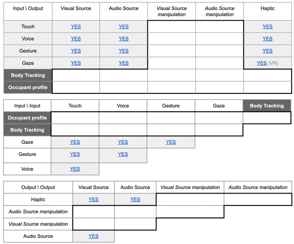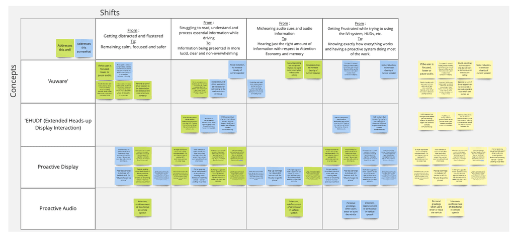 Based on the Initial Research, we built a table (see image below) charting the different input modalities (such as touch, voice, gesture, etc) on the Y-axis and mediums of output (visual, auditory, haptic, etc). The modalities selected were a collection of modalities that the proprietary ADAS platform utilized in our thesis project was capable of tracking/monitoring. We used co-design workshops and methods like ARSCI (Adding, Removing, Skewing, Combining, Imbalance) to generate multiple design concepts. This phase emphasized open exploration, leading to various ideas on how to transform raw sensor data into meaningful user experiences.