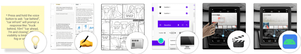 From L to R, we started of with simple post-it ideas, wrote scenarios for storyboards, created mockups, showcased interactions in video prototypes, and finally realized the ideas as Android Apps using the softwares Kanzi and Android Studio.