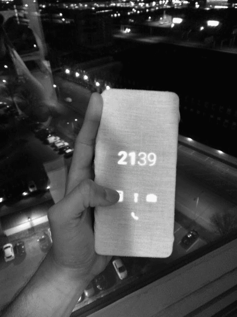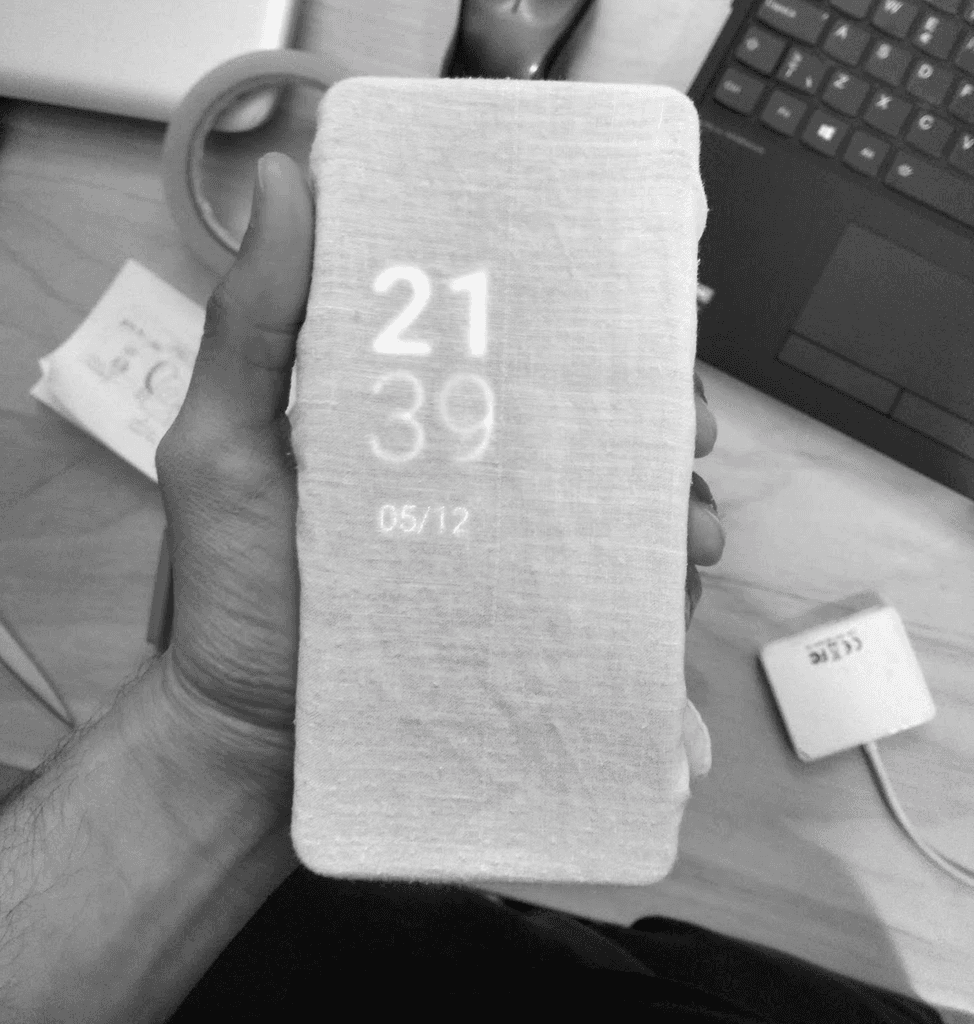 The soft light of the orb permeating through the white woven fabric front of the case contrasts the sharp and bright display which sits beneath it. The micro-weave fabric was a deliberate choice as it is an optimal light diffusion material, which softens the display backlight and provides an aesthetic blur.