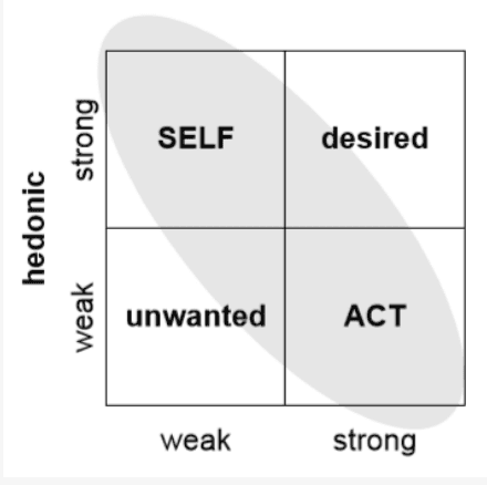 Hassenzahl, M (2003) The thing and I: Understanding the relationship between user and product also describes using pragmatic or hedonic attributes of products to classify them as either ACT or SELF.