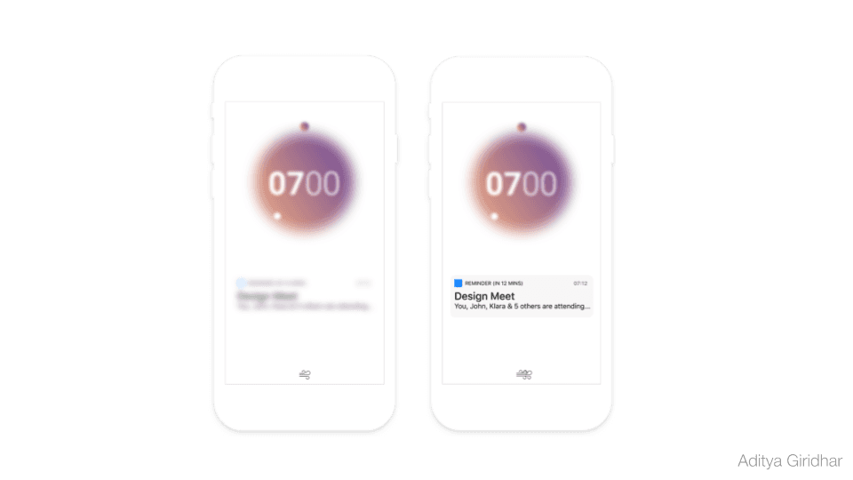 When an app sends out an important notification such as a Calendar Reminder, [calm] ensures that the process of receiving such a notification isn’t jarring at all. For instance an upcoming reminder will start to gradually emerge behind a cloud of “fog”, and proceed to clear up as the time of notification approaches. The user may choose to take a quick peek at the upcoming notifications by blowing away the “fog”, momentarily.